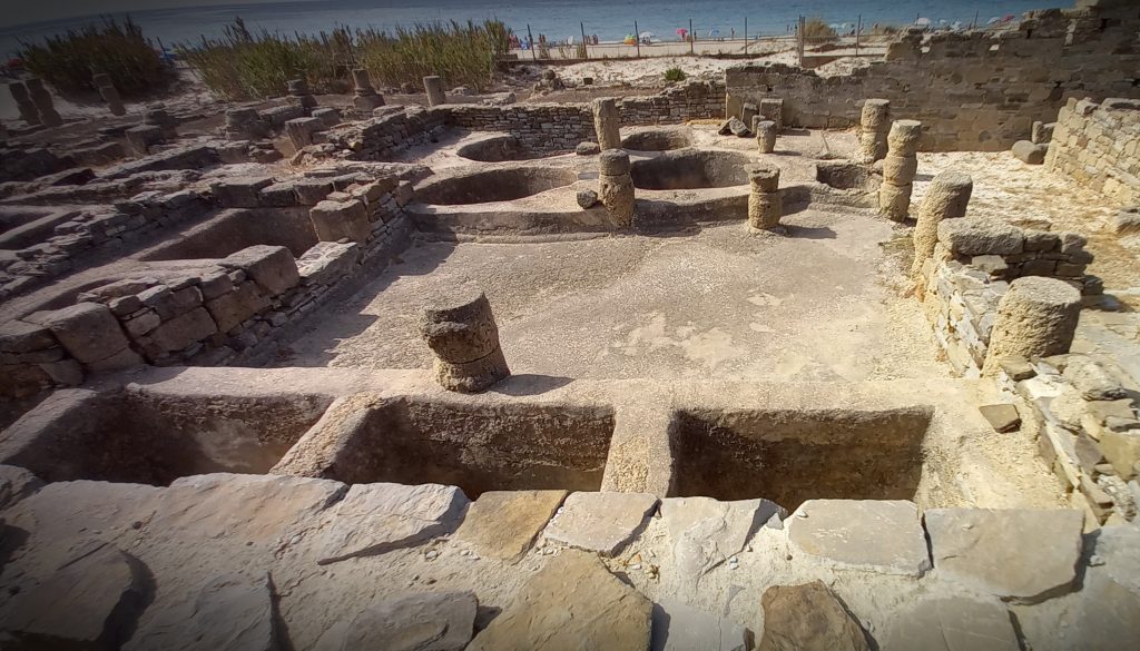 Los fenicios eran ante todo comerciantes, famosos por sus tejidos de púrpura y por exportar salazones. Las pilas de una de sus factorías conservan todavía la impermeabilización y la hendidura central que facilitaba la limpieza de los restos de pescado.